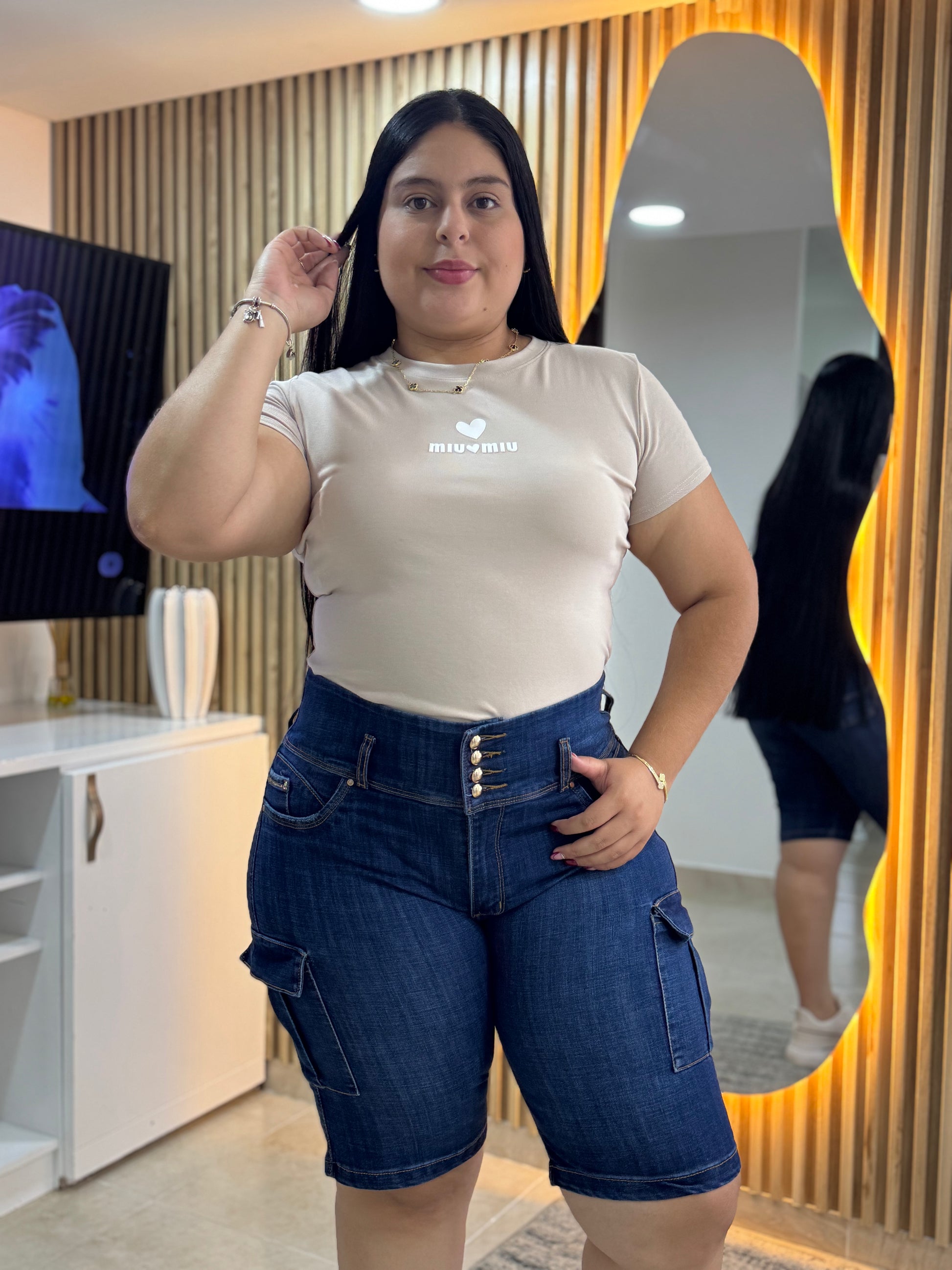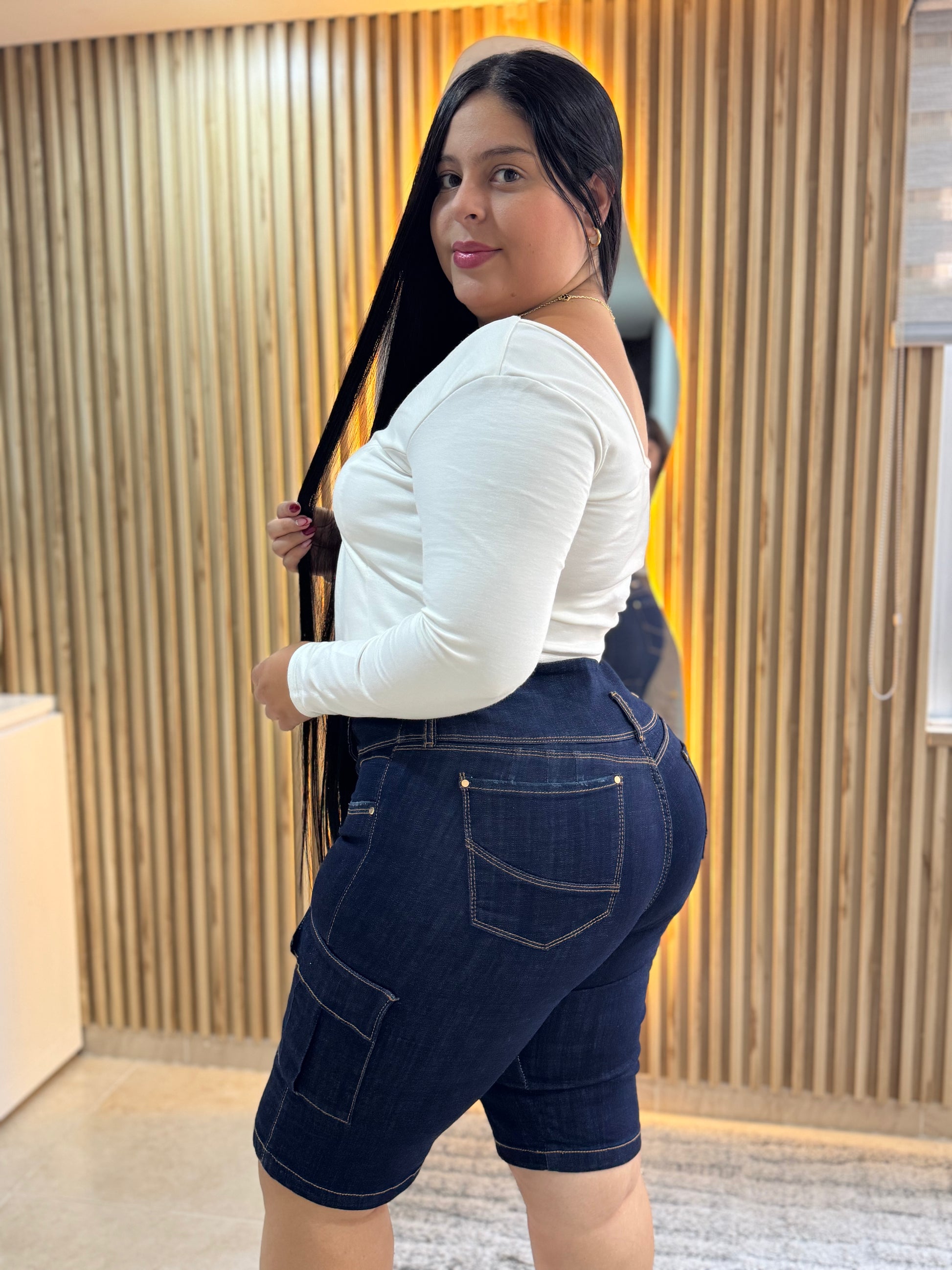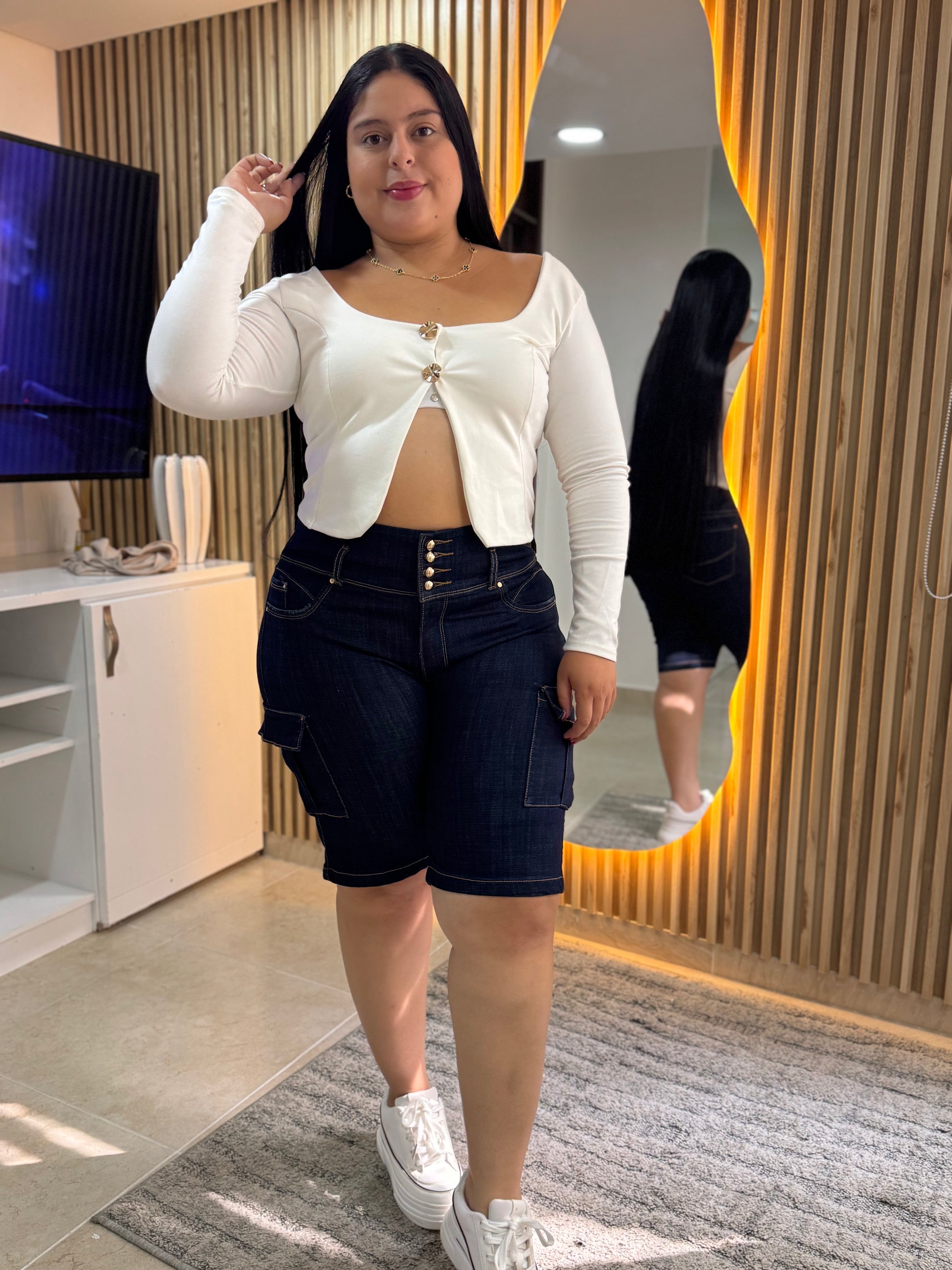 Esta bermuda cargo en tela strech talla plus no es solo una prenda, es una actitud. Con un largo cómodo que estiliza y unos brillos aplicados con el toque justo, esta bermuda es perfecta para elevar cualquier outfit sin perder la esencia urbana.