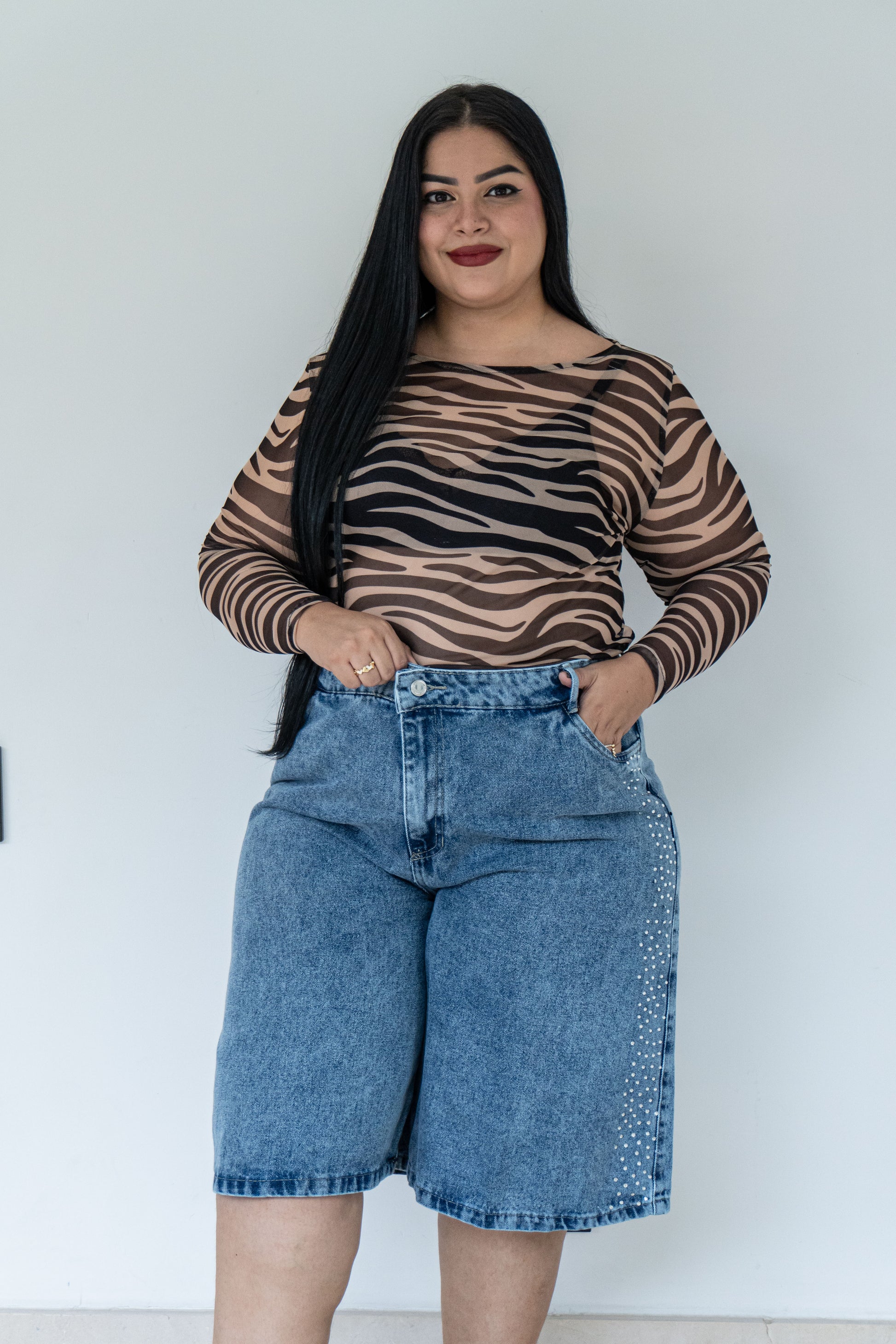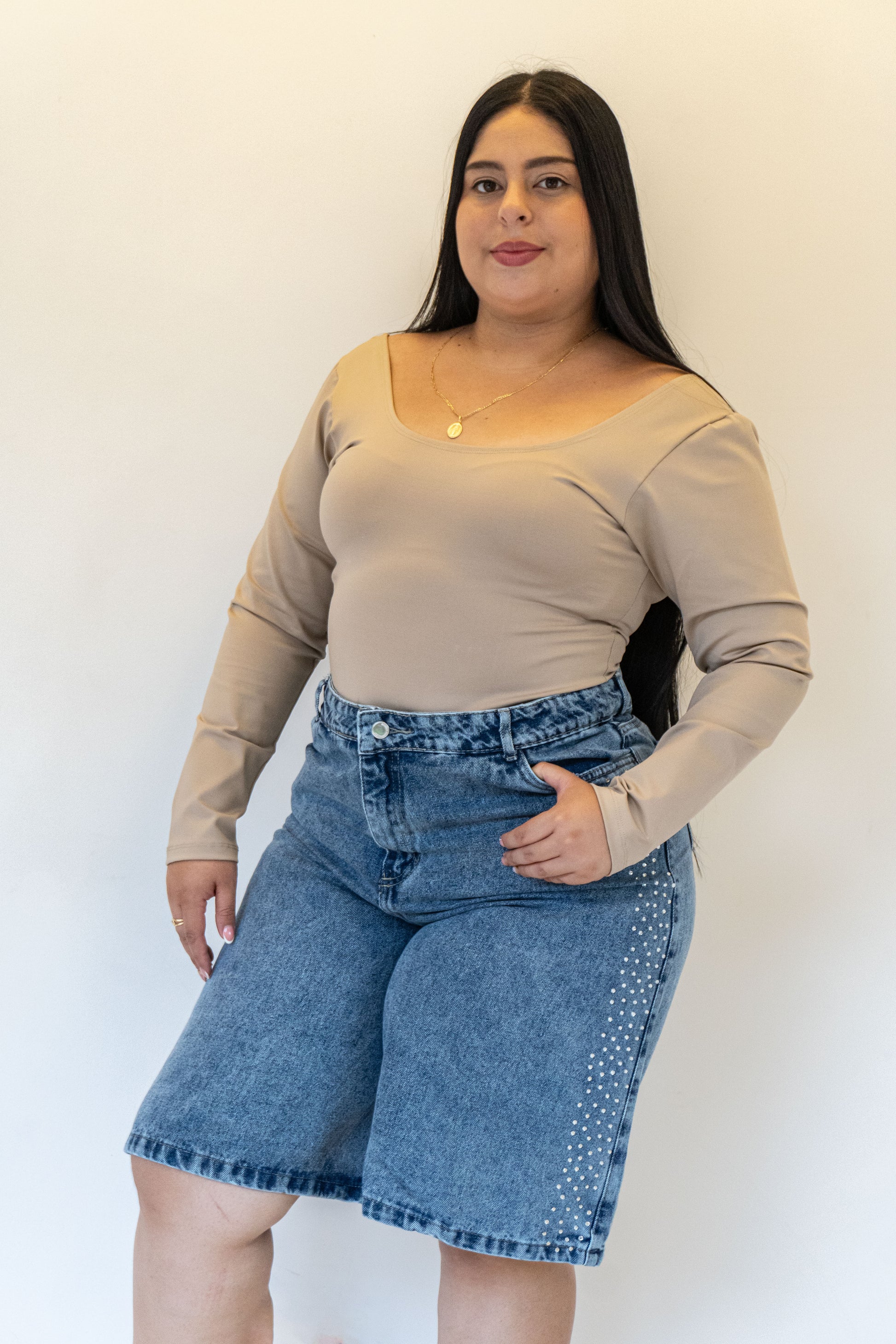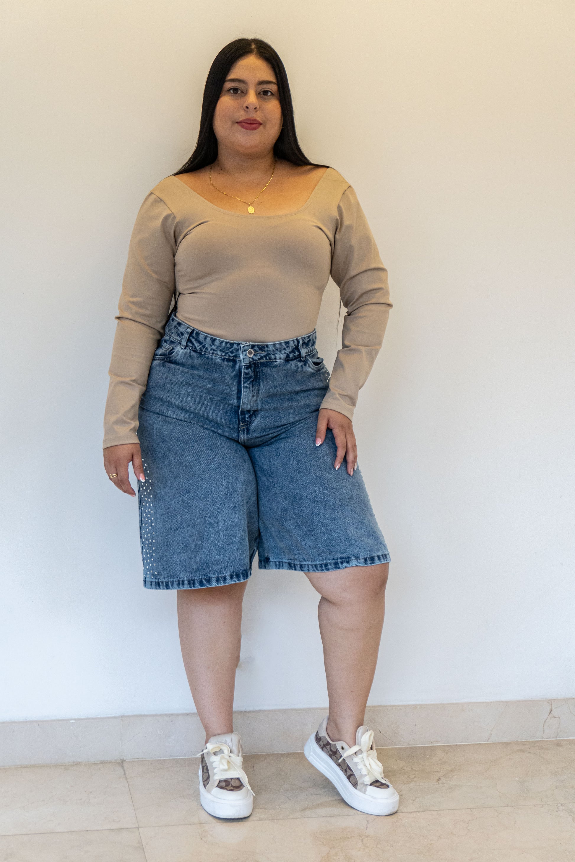 Esta bermuda cargo en tela rígida con brillos talla plus no es solo una prenda, es una actitud. Con un largo cómodo que estiliza y unos brillos aplicados con el toque justo, esta bermuda es perfecta para elevar cualquier outfit sin perder la esencia urbana.