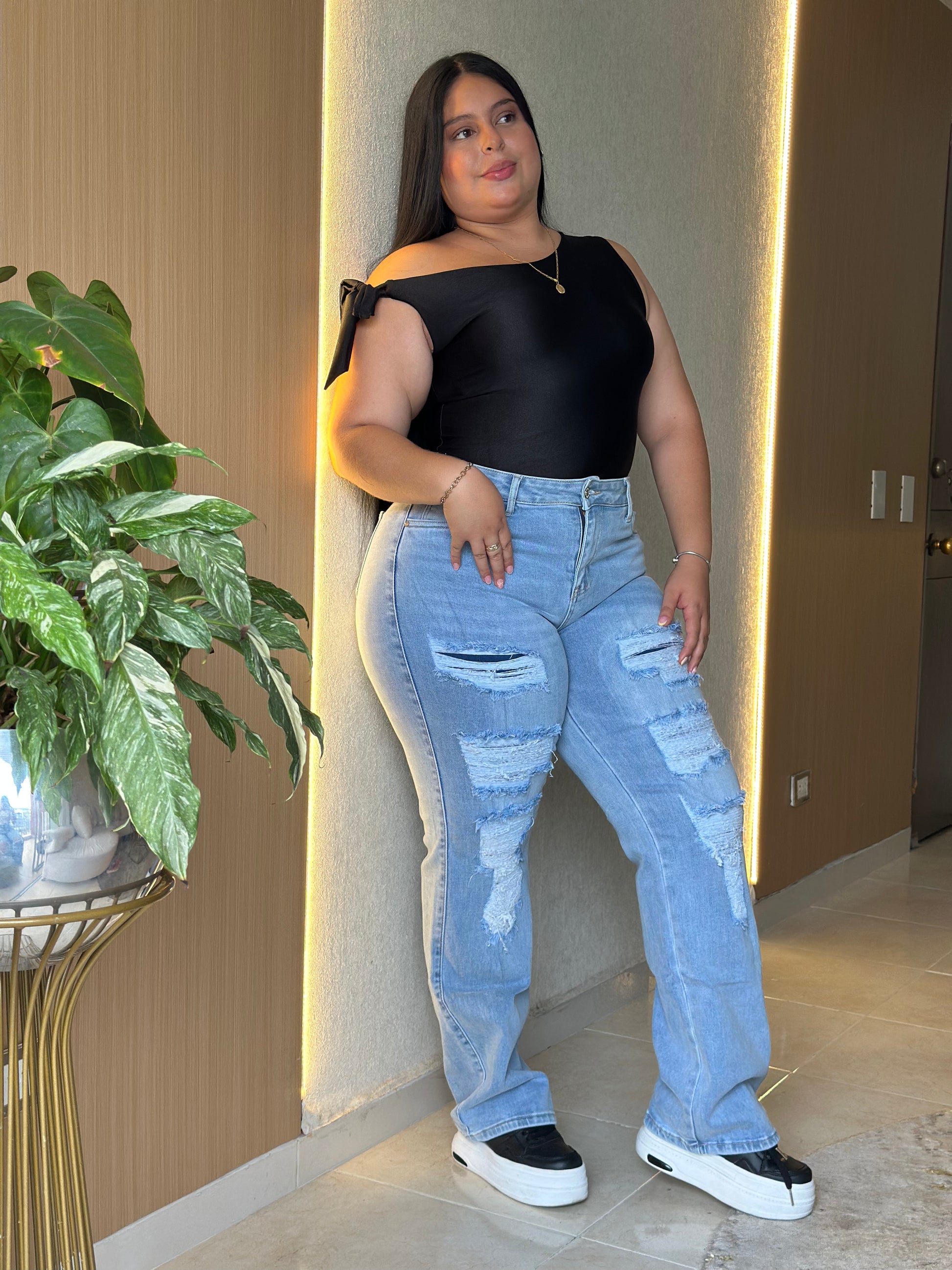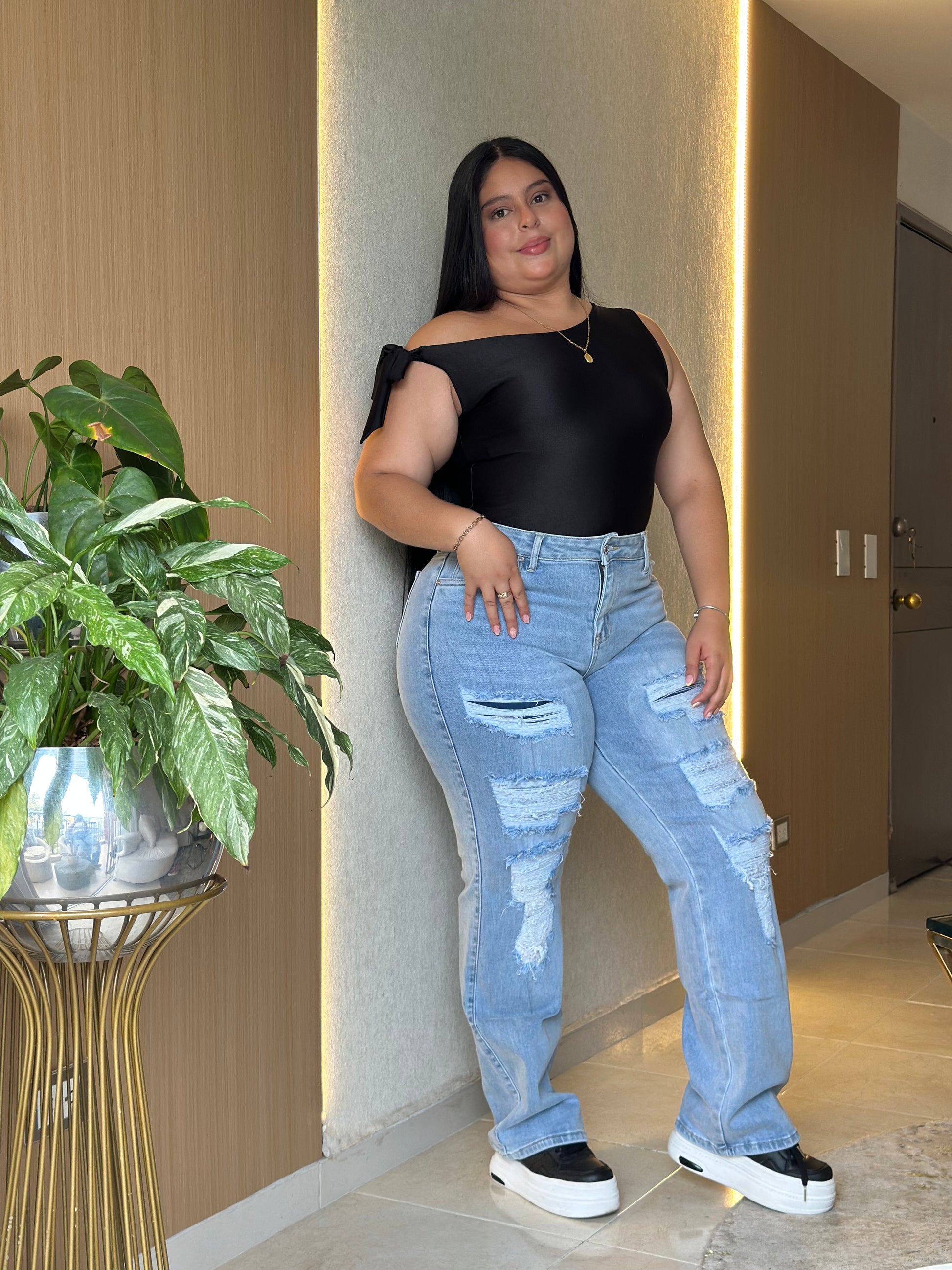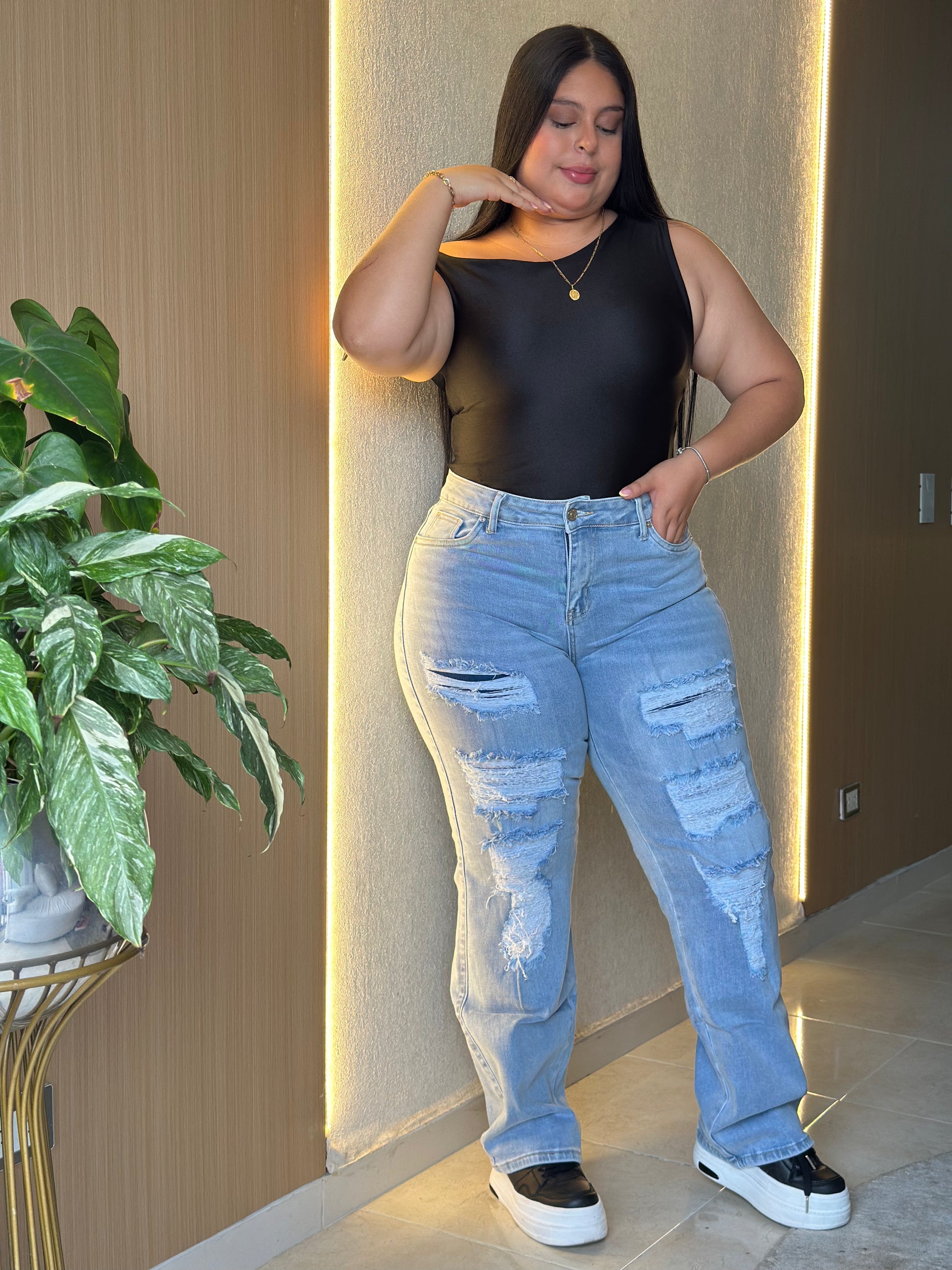 "Llevo años buscando un jean plus size que me quede bien de cintura y piernas. ¡Este es perfecto! Se siente firme, no se baja y la tela es de excelente calidad."